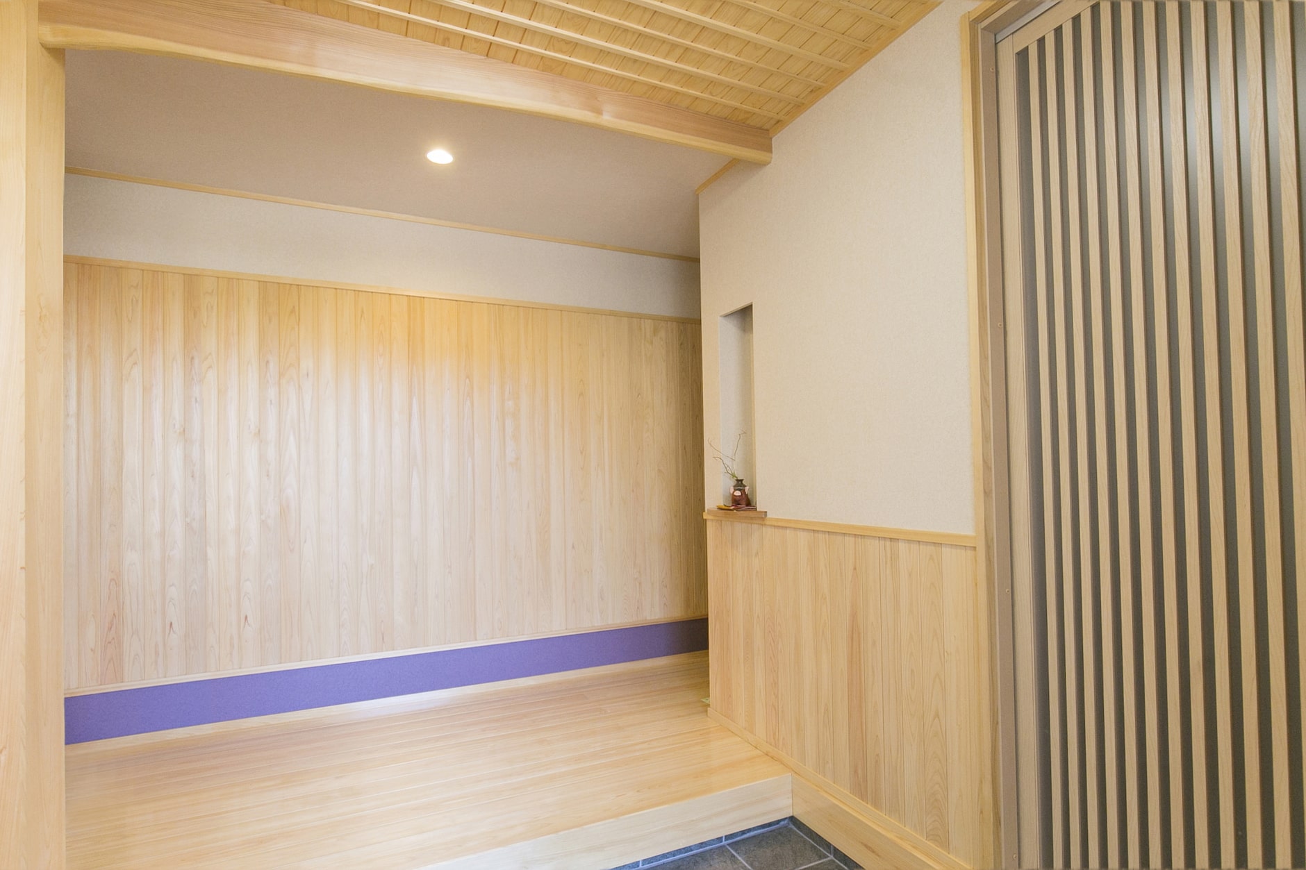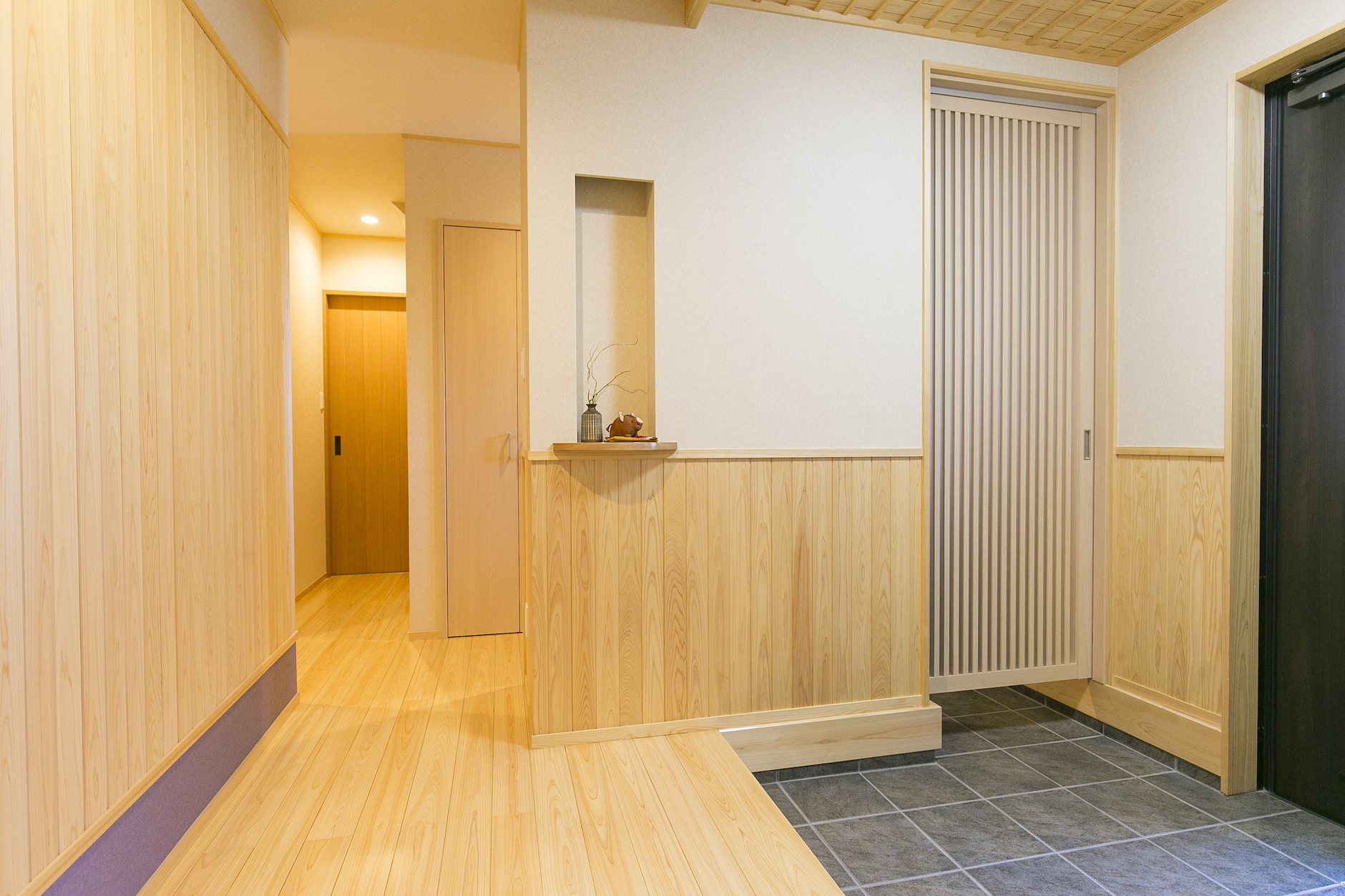 2世代ご家族様の送迎にふさわしい、和の温かみのある玄関。見えなければ分からない柱や筋かいなどこそ最大の努力をいたします。
